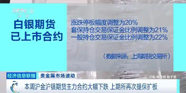 (央视财经《经济信息联播》)本周,沪金、沪银期货主力合约大幅下跌。为防范市场风险,昨天(2月5日)晚间,上海期货交易所宣布自2026年2月9日(星期一)收盘结算时起,对黄金、白银等期货已上市合约进行“提保扩板”,也就是提高保证金比例、扩大涨跌停板幅度。 总台央视记者 郝佳琪:2月6日,国内贵金属期货市场延续跌势,其中沪银期货主力合约盘中跌超18%,一度逼近跌停,截至收盘跌14.92%,报每千克18799元;沪金期货主力合约开盘跌超5%,收盘跌幅收窄至2.02%,报每克1090.12元。 本周,贵金属期货高位回调,沪银期货主力合约价格累计跌幅超37%,沪金期货主力合约价格累计跌幅超8%。 昨天晚间,上海期货交易所发布通知,白银期货已上市合约的涨跌停板幅度调整为20%,套保持仓交易保证金比例调整为21%,一般持仓交易保证金比例调整为22%;黄金期货方面,分别调整为17%、18%以及19%。此外,今天(2月6日)下午,上海黄金交易所也发布通知,自2026年2月9日收盘清算时起,对Au(T+D)、Ag(T+D)等合约的保证金比例和涨跌幅限制进行调整。 国信期货首席分析师 顾冯达:自一月底以来,国内交易所多轮系列组合拳,其实也起到了针对海外情绪化高波动进行的价格传导的防波堤作用,国内投资者对大类资产应普遍加强风险管控。 来源:央视财经 编辑:令文芳 |