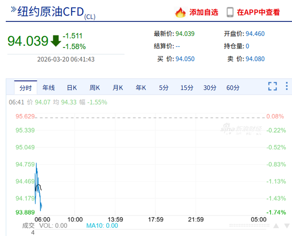 国际油价下挫。截至发稿,纽约原油跌1.58%,报94.03美元/桶。此前,19日收盘,纽约原油跌0.19%收于每桶96.14美元;布伦特原油涨1.18%,收于每桶108.65美元。