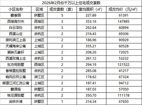 潮新闻客户端 记者 吴佳怡 2月,受到春节假期影响,杭州市区(含临安、富阳)共成交二手房3370套,同比去年2月下滑43.1%,环比今年1月下滑了51.8%。成交量虽不大,但各个维度的数据已提前展现出楼市“小阳春”的温度。杭州我爱我家数据显示,大年初八复工以来,成交量、带看量、挂牌量都迅速升温。2月24日-28日间,成交量对比去年同期上涨了34%,挂牌量同比上涨了33%,新增客源量同比增加了37%。 杭州2月各价格段二手房成交占比 (数据来源:杭州我爱我家) 杭州2月各面积段二手房成交占比 (数据来源:杭州我爱我家) 2月二手房成交呈现“两头热” 800万以上二手房占比提升 2月的成交中,刚需购房仍占据了主导地位,整体成交呈现低价、高价两头热。杭州我爱我家数据统计,2月200万元以内的二手房成交占比49.17%,和1月的49.47%基本持平。而200万元-600万元区间的房源成交占比相较1月纷纷下滑,总价600万元以上的二手房成交占比提升,其中提升比例最高的是800万元以上的二手房。2月成交占比4.85%,同比1月的3.33%增长了1.52个百分点。 从面积段上来看,占比最高的是60-90㎡,达到35.3%,但比1月下滑了4.1个百分点。其余面积段成交占比均有提升,60㎡以下的二手房成交占比提升1.7个百分点,140㎡以上的二手房成交占比提升1.4个百分点。 不含临安和富阳,刚需成交量最大的住宅小区是翡翠城和天都城,2月分别签约10套。翡翠城成交均价27916元/㎡,套均面积122㎡;天都城成交均价13190元/㎡,套均面积96㎡。 成交前20的小区中,有超过半数小区均价为“1字头”,融创城、江与城、万科未未来城分别成交了7套,签约均价都不到2万元/㎡。 2月杭州住宅成交前20小区(不含富阳、临安,数据来源:杭州我爱我家) 千万以上豪宅成交65套 馥香园签约5套再成第一 2月,杭州800万元以上住宅共成交了88套,其中1000万元以上成交了65套,占比74%。成交第一的依旧是馥香园,签约5套。2025年,馥香园引领千万豪宅市场,共成交156套,在杭州所有住宅小区中排名16位。据中介表示,馥香园交付至今,小区已有超过1/4的房源被换手。 不过热度虽高,馥香园的价格却难增长。大面积房源成交单价在7万元以上,小面积房源单价不到6万元,个别低楼层急售的的房源单价低至6万元出头。 除了馥香园,2月西湖高尔夫、白云深处也分别成交了3套,总价都在千万以上。 上城区多个高端改善次新房也在2月表现突出,例如南星桥上品成交了2套,钱二天澜海岸、潮映万象轩分别成交2套,御道江河汇也成交了2套。 2月虽还未到学区房交易高峰期,但部分家长也开始提前置业。2月成交量最大的依旧是顶流保俶塔实验学校的学区房,共成交20套。学区内丁香公寓、金祝新村、胜利新村等小区都有两三套成交。其次是江南实验学校和钱塘区启成实验学校的学区房,分别成交了18套。江南实验学校中东方郡成交了4套,御滨府、温馨人家、晓风印月各成交了2套。 2月杭州总价千万以上成交热门小区 (数据来源:杭州我爱我家) |