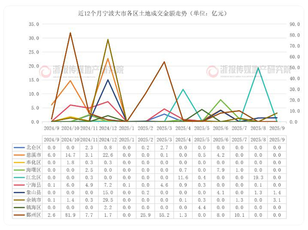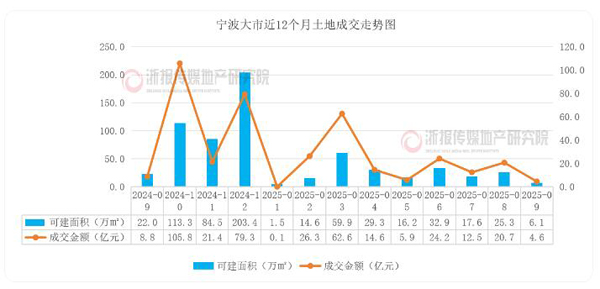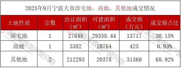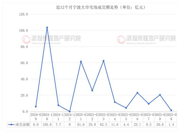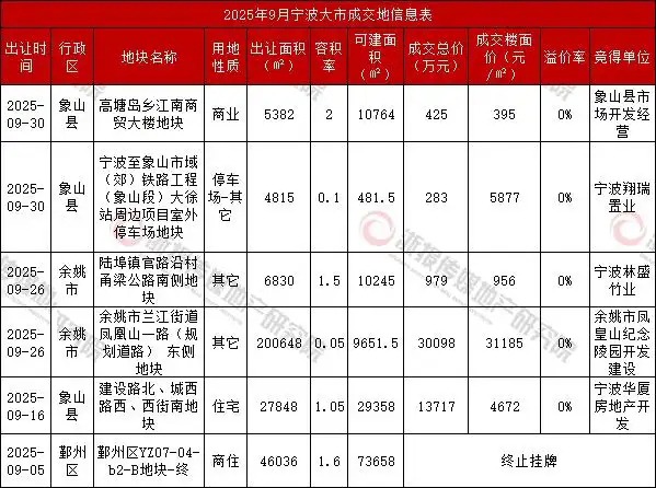 潮新闻客户端 记者 郑青青 通讯员 万雪丽 根据浙报传媒地产研究院“决策通”大数据统计,9月初宁波全市经营性用地继续呈现缩量态势,成交规模与价格同步下行。在“高品质住房供给”与“优化存量房收购政策”双重政策引导下,市场整体仍处于调整阶段。值得关注的是,月底市区供应端出现积极信号,海曙核心区域推出2宗涉宅用地,此次集中放量有望为第四季度土地市场的企稳回升注入动力。 重点提要 NO.1 数据:9月量价持续探底 供应规模回升 9月宁波大市土地市场成交呈现量价齐跌、热度探底,单月土地成交溢价率均以底价或接近底价成交。 涉宅地市场上,9月宁波大市共计成交1宗涉宅地,总成交金额1.37亿元,环比下降93%,溢价率仍维持低位。 依据现有土地出让公告,10月本市涉宅用地供应将迎来增长,共计4宗地块拟出让,其中海曙区为绝对主力。此次集中放量,有望带动土地市场回暖,为第四季度土地市场的企稳回升奠定了基调。 NO.2 大市内仅1宗涉宅地成交 市区暂无成交 9月宁波大市内仅有1宗涉宅地块出让,位于象山县老城区——建设路北、城西路西、西街南地块,由宁波华厦房地产开发以13717万元总价竞得,成交楼面价为4672元/㎡,溢价率0.37%。 核心数据 2025年9月,宁波大市单月经营性土地共计供应6宗经营性用地,其中5宗成功出让,1宗因故终止。 其次成功出让的5宗经营性用地,成交总建筑面积6.05万㎡,环比下降76%;土地出让金4.55亿元,环比下降78%。其中涉宅地成交1宗,出让面积2.78万㎡(约42亩),总建筑面积2.94万㎡,成交金额1.37亿元。 10月,宁波市预计出让4宗涉宅用地,分别为2宗海曙区,2宗宁海县,总出让面积约15万㎡,总建筑面积26.25万㎡,起始总价18.67亿元。 一、9月宁波大市涉宅地成交1.37亿元 2025年9月,宁波大市共计供应6宗经营性用地,其中成功出让5宗,用地面积24.55万㎡(约368.3亩),总建筑面积6.05万㎡,成交金额4.55亿元。 其中市六区因故终止1宗经商住土地,出让面积4.6万㎡(约 69.1亩),总建筑面积7.37万㎡。 象山县成交3宗经营性用地,其中1宗纯住宅用地,出让面积2.78万㎡(约41.77亩),总建筑面积2.94万㎡,成交金额1.37亿元。1宗商业用地,出让面积0.54万㎡(约8.07亩),总建筑面积1.08万㎡,成交金额425万元。1宗其他用地,出让面积0.48万㎡(约7.2亩),总建筑面积0.05万㎡,成交金额283万元。 余姚市成交2宗其他土地,出让面积20.75万㎡(约311.22亩),总建筑面积1.99万㎡,成交金额3.11亿元。 本月海曙区、鄞州区、江北区、奉化区、镇海区、北仑区、宁海县、慈溪市无土地出让成交。 2025年9月,宁波大市1宗涉宅地块成交,出让面积2.78万㎡(约41.77亩),总建筑面积2.94万㎡,成交金额1.37亿元。 1宗商业地成交,出让面积0.54万㎡(约 8.07亩),总建筑面积1.08万㎡,成交金额425万元。 2宗其他地成交,出让面积21.23万㎡(约318.44亩),总建筑面积2.04万㎡,成交金额3.14亿元。