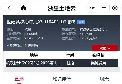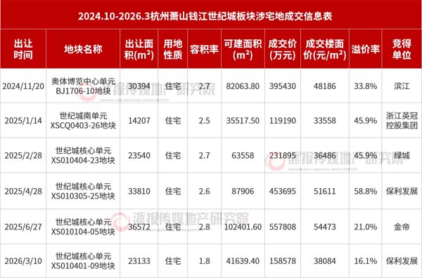潮新闻客户端 记者 马梦婷 今日,杭州萧山钱江世纪城一宗宅地出让,体量约4.2万㎡,建筑高度不大于54米。值得注意的是,地块容积率仅1.8,这是钱江世纪城板块的历史上,容积率最低的涉宅项目之一,其他容积率为1.8的两个项目,还要追溯到2015年成交的碧桂园·珑悦、2013年成交的顺发·美哉美城。 十余家房企参拍,竞价23轮后,最终地块由保利发展揽获,溢价率定格16.1%,成交楼面价38084元/㎡,较2025年成交、容积率2.5的建发英冠·宸云楼面价项目(33558元/㎡),楼面价拉升约四千每平方米。竞争激烈程度逊于上周的城东新城宅地。 至此,保利发展拿下了3月杭州唯二两宗宅地。 在浙报传媒地产研究院的留言板上,有不少人参与了地价竞猜。然而,与几日前城东新城宅地竞价超百轮的热烈场面相比,今天的竞争程度似乎未能达到不少人的预期。 图 |浙江土地网直播留言板截图 ↑↑↑出让过程和结果可戳小程序回顾 根据今日地块出让成交情况,主要有以下几点观察: ①第一梯队优质宅地是房企精准的“安全押注”,但竞价中理性依然占据首位,板块内部的深度分化成为市场的敏感刻度。 作为2025年杭州涉宅用地出让金额最高、价格水平也处于第一梯队的板块,钱江世纪城无疑是实力房企实现快速去化的优选之地。房企的需求虽各有不同——无论是为了维持市场份额、提振信心,还是安全穿越周期,又或是在尖端市场拓局——都促使该地块在正式开拍前,吸引了包括民企、混合制企业、国央企在内的十余家市场主体积极关注。 然而,当前市场情绪保持着理性,对短周期变化尤为敏感。今日钱江世纪城地块16.1%的溢价率显得相对克制,房企在热情参拍之下,实则对市场风险保持高度警惕。当前,杭州乃至全国房地产市场仍处调整期,尽管多个重点城市的热点地块释放出一定的回暖信号,但从今日杭州的成交情况来看,房企虽有参拍意愿,却最终竞争明显不及前几天城东新城地块竞价超百轮、溢价率达51%的火热局面。点击回顾>>> 图 | 地块区位图(来源:决策通) 今日成交地块位于世纪城南区域,与配套成熟、界面优越的北段核心相比,市场认可度仍存在落差。尽管该地块与滨江·奥映鸣翠府相距不远,但其北侧紧邻高架,1.8容积率属性下却较难形成高端住宅所需的静谧氛围,且地块呈狭长形,对项目规划排布及产品营造形成一定制约。反观此前备受追捧的城东新城地块,无明显短板,且有南向运河景观优势,因而能吸引房企多轮角逐。 由此来看,今日地块溢价率最终定格在16.1%,实则是房企紧密关注市场的同时,对微观差异的精准审视。 图 | 地块航拍图 图 | 2024.10-2026.3杭州萧山钱江世纪城板块涉宅地成交信息表 ②结构性机会仍存,近期供地节奏或迎精细化调整。 尽管未以高热成交,但地块拥有与杭州之门、奥体中心站点直线距离在1.2km左右的客观区位,且附近在售项目多数已进入销售中后期,未来竞争压力可控,叠加1.8的容积率,可打造出区别于周边项目的差异化产品。在此背景下,地块未来的开发空间仍值得期待。这也或许是保利发展果断出手的原因——截至今日,3月出让的仅有两宗涉宅用地,均被保利发展收入囊中。至此,本月杭州涉宅地平均溢价率拉升至37.4%,为2025年4月以来的最高。 图 | 2025.1-2026.3杭州市区涉宅地成交平均溢价率 据浙报传媒地产研究院统计,2026年一季度杭州共出让2批次、3宗涉宅用地,与2025年一季度出让的10批次、32宗涉宅用地相比大幅减少,量价处近年同期低位。这种减少主要也源于供应端的主动收缩:杭州2026年全市计划出让经营性用地6000亩,较2025年的7000亩供应计划明显下调,降至近十年来的新低。 而近期土地市场热度回升,是否会对后续供应节奏形成正向反馈?优质地块的推盘窗口与结构又是否会迎来动态微调,回应市场对核心板块的价值追逐?截至目前,4月杭州市区有3宗涉宅用地确定出让,总体量超23.2万㎡,涉及西兴、下沙、闲林多个板块。 地块解读 该地块位于钱江世纪城南面区域,紧邻萧山市北板块。地块区位较好,周边商业如奥体印象城、医疗如省妇保钱江院区、教育等配套均在2公里范围内,附近有学军中学教育集团文渊中学、学军中学教育集团文渊实验学校、崇文世纪城实验学校等学校。 此外,地块西侧直线距离地铁7号线兴议路站点约400米,东侧距离地铁15号线丰二路站约540米,交通便捷。 地块规划条件较为复杂,项目为全市住宅品质提升试点项目,应符合《杭州市住宅品质提升设计导则(试行)》要求,配套公建面积不大于地上总建筑面积的10%。配建不少于1220㎡的社区配套用房;公厕1处不小于75㎡,文化活动室1处不小于600㎡,康复站1处不小于40㎡。该地块项目为全市住宅品质提升试点项目,应符合《杭州市住宅品质提升设计导则(试行)》要求,层高不小于3米,架空层不小于4米。新建住宅建筑高度最高部分与最低部分高度比不超过3:1,建筑层数最低部分不应小于四层。住宅建筑不得建设别墅类(合院、双拼)产品。 图 | 地块城市设计导则要求 目前地块周边在售项目较多,但多数进入销售中后期,未来竞争不大。建发英冠·宸云目前高层在售均价5.4万元/㎡,联排在售均价9.8万元/㎡。市北绿城·晓澜玉华轩高层在售5.3万元/㎡,叠排7.3万元/㎡。 3881 人正在交流 #口水楼市聊侃辨砸 角力楼市舆论 |