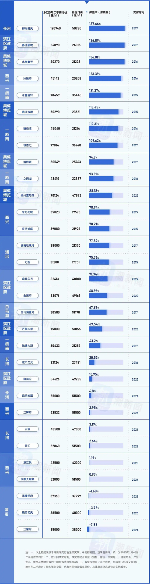 潮新闻客户端 记者 徐淑竞 黄磊 钱塘江南岸如今已是杭州都市风景线不可或缺的一部分,以滨江区和奥体板块为代表的区域,上市公司云集,城市界面摩登,高端住宅层出不穷,区域内购买力惊人。 根据潮新闻美好生活研究院的统计,这一带最近10年保值率最高的楼盘是绿城九龙仓柳岸晓风。 柳岸晓风位于滨江区复兴大桥西南侧,小区北侧就是樱花大道,直面钱塘江,对岸可见西湖群山,杭州优质景观资源尽收眼底。另外,小区周边配套丰富,滨江宝龙、龙湖滨江天街等商业配套都在附近。 图源视觉中国 优质的地段和产品,让柳岸晓风在二手房市场上一直属于稀缺资产,自交付以来,无论是高层还是排屋产品,拿出来卖的房子并不多。目前,小区二手房均价约12094元/㎡,相比新房销售时期的价格,房价涨幅为137.46%。 保值率紧随其后的是春江郦城和水榭春天,这两个小区目前二手房均价相比新房时期,涨幅分别为136.89%和136.81%。板块内名气很大的豪宅银杏汇,房价涨幅则约109.62%。 而浦沿板块的个别次新楼盘,则出现了二手房价格低于新房均价的情况。比如江荣府小区,新房均价38000元/㎡,但目前二手房均价约为35000元/㎡,保值率为-7.89%。 口水楼市聊侃辨砸 角力楼市舆论去圈子 > |