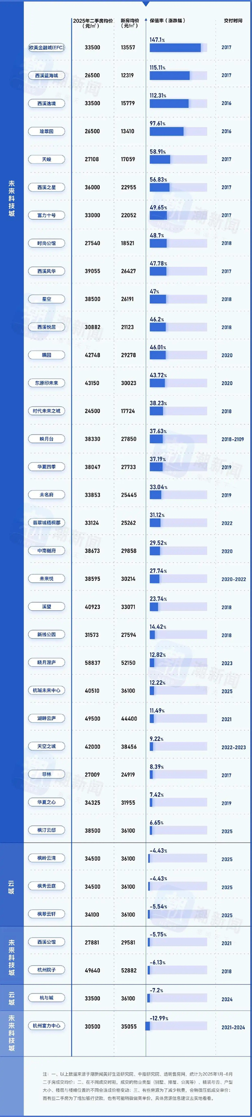 潮新闻客户端 记者 黄磊 孙晨 制图 蓝鋆滋 提到未来科技城,就不得不提到2013年阿里巴巴的入驻,此后杭州大城西迎来一场浩浩荡荡的“造城运动”,而未来科技城的城市配套在那段时间飞速发展,大厂概念风生水起,大批“码农”定居于此,成为板块的首批“原住民”。 那段时间,也是未来科技城新房市场最为疯狂的一个阶段,从欧美金融城(EFC)到“未科三兄弟”,从2016年到2020年,房价一路飙升。“未科三兄弟”有楼盘的部分房源二手房签约均价超过6.5万元/平方米,几乎是新房价格的一倍还要多。 不过经过几轮调控后,杭州楼市目前正处在“低空飞行”期,未来科技城板块也早已没有了之前的光环,而云城作为未来科技城继续发展的补充,已经成为新的热点,那么它们现在的保值率到底如何?潮新闻美好生活研究院选取了近40个次新房小区样本,结果发现,大部分次新房小区的成交均价已经回落至4万元/平方米内。 我们拿比较典型的“未科三兄弟”(东原·印未来、中南樾府、阳光城·未来悦)举例,这几个楼盘的保值率从27.7%-43.7%不等,而这已经是拿2025年二手房成交数据做对比,可见,当时的未来科技城“原始股”,在目前这种行情下,依旧拥有一定的保值率。而目前这三个楼盘的二手房成交均价,也仅仅比板块在售新房高了一点。 从整个未来科技城板块的保值率看,最高前三位依次是欧美金融城、西溪蓝海城、西溪逸境,它们的保值率都在100%以上,且都为2016-2017年交付,当时新房的价格都在1.2万-1.5万元/平方米,因为买入价非常低,所以基本不可能破发,所谓“买到即赚到”。 图源视觉中国 但2023年之后买入的新房,由于受到市场整体下行的影响,其大部分二手房价值的保值率都不高,甚至有些还破发了。而个别房企受困于自身发展,像泰禾杭州院子,本身地段也非常不错,但其2025年的二手房成交均价已经低于新房成交价,完全取决于购房者愿意以多少价格接盘。 另一个近些年发展起来的板块——云城,大部分楼盘从2024年开始交付,时间轴并未完全拉开,从现有的样本来看,基本都是破发的状态,但相信随着时间的推移,配套逐渐完善,再加上杭州西站的buff叠加,之后云城板块的价值或许才会慢慢显现。 口水楼市聊侃辨砸 角力楼市舆论去圈子 > |