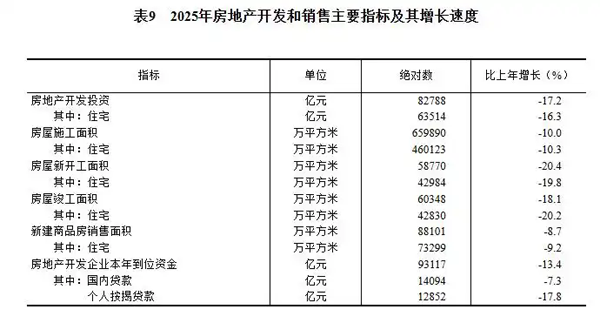 潮新闻客户端 记者 蒋敏华 2月28日,国家统计局官网发布《中华人民共和国2025年国民经济和社会发展统计公报》。 其中指出,全年房地产开发投资82788亿元,比上年下降17.2%(较2024年同比降福扩大6.6个百分点)。其中住宅投资63514亿元,下降16.3%;办公楼投资3203亿元,下降22.8%;商业营业用房投资5947亿元,下降14.0%。全年新建商品房销售面积88101万平方米。二手房交易网签面积73685万平方米。年末新建商品房待售面积76632万平方米,其中商品住宅待售面积40236万平方米。 全年全国配售型保障性住房、保障性租赁住房和公租房等开工建设和筹集121万套(间);城市危旧房改造开工17万套;新开工改造城镇老旧小区2.7万个,惠及居民499万户;农村低收入群体等重点对象农村危房改造和农房抗震改造开工21.9万户。