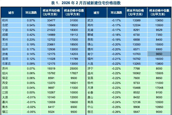 ▲2月25日,上海闵行莘庄商务区新建居民区 图据视觉中国 根据中国房地产指数系统百城价格指数对全国100个城市新建、二手住宅销售市场及50个城市租赁市场的调查数据,2026年2月,全国100个城市新建住宅平均价格为17107元/平方米,环比下跌0.04%。从涨跌城市个数看,15个城市环比上涨,84个城市环比下跌,1个城市持平。同比来看,全国100个城市新建住宅平均价格同比上涨2.37%。 全国100个城市二手住宅平均价格为12835元/平方米,环比下跌0.54%,跌幅较上月收窄0.31个百分点。从涨跌城市个数看,5个城市环比上涨,95个城市环比下跌。同比来看,全国100个城市二手住宅平均价格同比下跌8.78%。 全国50个城市住宅平均租金为33.96元/平方米/月,环比下跌0.11%;从涨跌城市个数看,11个城市环比上涨,38个城市环比下跌,1个城市环比持平。同比来看,全国50个城市住宅平均租金较去年同期下跌3.79%。 具体城市来看,红星新闻记者注意到,杭州新房环比涨幅领跑全国,合肥、宁波、成都、常州等紧随其后。同比方面,上海、杭州、成都、合肥同比分别上涨9.94%、9.11%、6.80%、6.09%。