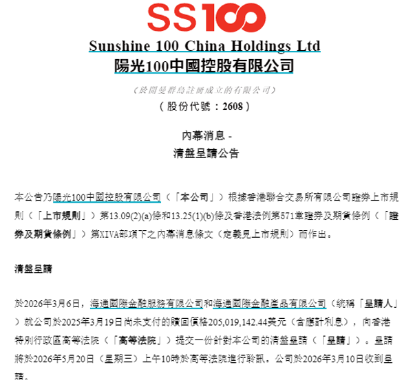 界面新闻记者 | 王妤涵 一笔旧债,将阳光100中国(02608.HK,下称阳光100)这家长期徘徊在仙股行列的房企再度推至悬崖边缘。 3月12日,阳光100发布公告称,因公司未能按期支付一笔2025年3月到期的2.05亿美元债务,债权人海通国际已向香港高等法院提交清盘呈请,聆讯定于5月20日举行。 这并非阳光100首次面临清盘威胁。早在2024年,公司就曾因另一笔债务被债权人柏顺(香港)提起清盘呈请,后经协商得以撤回。 从股权质押爆仓、控股股东被动离场,到如今直面清盘危机,近年来阳光100的经营困境持续恶化。此次清盘呈请并非突发事件,而是其多年债务高企、经营亏损、转型失利等问题的一次集中引爆。 界面新闻截图自公告原文 根据香港《公司(清盘及杂项条文)条例》第182条,自呈请发起之日(2026年3月6日)起,公司任何股份转让或财产处置,若未获高等法院认可令,均属无效。这意味着,即便阳光100试图通过资产处置自救,其操作空间也已受到严格限制。 面对清盘危机,阳光100在公告中明确表示“将反对呈请”,理由是董事会认为呈请并不代表其他利益相关者的利益,并可能损害公司价值。但在港股过往案例中,企业通过法庭辩论直接推翻清盘呈请的难度有多大? 上海易居房地产研究院副院长严跃进在接受界面新闻记者采访时给出判断:“过往案例中,直接通过法庭辩论成功反对清盘呈请的难度较高,成功率并不高。大多数公司会选择在聆讯前与呈请人达成和解,比如通过债务重组以撤回呈请。” 这意味着,留给阳光100的时间窗口其实只有两个多月。5月20日聆讯之前,公司必须拿出能够说服海通国际的实质性方案。 如果最终未能达成和解,法院颁令清盘,后果将极为严重。严跃进进一步指出:“如果最终被法院颁令清盘,公司资产将用于偿还债务及费用,现有股东的权益通常因清偿顺序靠后而价值极低,甚至可能归零。” 清盘呈请之所以致命,根源在于阳光100自身早已积重难返。 界面新闻梳理该公司近年财报发现,阳光100已连续多年陷入深度亏损。2021年至2024年,扣非后股东应占亏损分别高达36.06亿元、29.57亿元、29.71亿元和56.47亿元。2025年上半年,亏损虽有所收窄,但仍达12.28亿元。 阳光100近年营利情况 界面新闻整理制图 更令人担忧的是资产负债状况。截至2025年6月30日,阳光100每股账面资产净值已跌至负2.782元,持有的现金及现金等价物仅为5.51亿元,而同期公司的贷款和借款总额高达128.91亿元,偿债缺口悬殊。 从业务结构来看,阳光100的困境也折射出其转型策略的失败。公司曾以“阳光100”品牌在天津、重庆、武汉等22个城市开发多用途商务综合体和复合性社区。近年来,公司试图向“康养+文旅”方向转型,甚至接盘了李亚鹏的雪山艺术小镇项目。 但文旅项目投资周期长、资金沉淀大,在行业下行周期中反而加速了资金链的紧绷。如今,该项目公司已进入破产审查程序,成为阳光100转型失利的典型注脚。 阳光100的境遇并非孤例。就在同一天,富力地产也被传出董事长李思廉因债务问题被限制出境,引发市场对出险房企信用端的进一步担忧。 与此同时,自2025年以来,已有五矿地产、大悦城地产、北京建设等多家房企选择退出港股市场,行业迎来一波“退市潮”。这背后是房地产上市公司在资本市场的集体困境。 中指研究院企业研究总监刘水在接受界面新闻采访时分析了内房股退市潮的深层逻辑:首先,房地产行业上市公司估值长期深度折价,股权融资功能基本丧失。内房股普遍市净率低于0.5,部分公司股价较净资产折价70%至90%,在股价大幅破净的情况下,增发新股会严重摊薄股权,融资通道基本关闭。 其次,维护上市的成本高企,使得房企上市的性价比极低。港交所对上市公司的信息披露、内幕交易、关联交易监管日趋严格,每年需承担审计、合规、信息披露、投资者关系等数百万港元的固定成本。当融资收益为零时,这些成本便成为纯粹的财务负担。 第三,退市后企业可以摆脱资本市场的短期业绩压力,经营更加灵活。房地产市场深度调整,上市公司需按期披露业绩,股价短期压力较大。面对行业转型,企业难以实施长期、痛苦的战略调整,如大规模资产处置或业务重组。退市后,无需公开披露敏感的债务谈判、资产处置细节,可以减少市场负面解读与债权人的博弈压力,加速风险出清。 “2026年很可能成为部分港股中小房企的‘出清’之年。”严跃进在接受采访时直言,“面对巨额到期债务和低迷的销售环境,像阳光100这样缺乏融资渠道、持续亏损的企业,很难依靠自身经营摆脱困境。随着债权人失去耐心并通过法律途径追债,预计行业内的清盘、债务违约和重组案例将显著增加。” 这也意味着,对于阳光100而言,即便此次能够暂时化解清盘危机,其长期生存能力依然存疑。在市场分化加剧、融资持续收紧的背景下,缺乏优质资产和稳定现金流的尾部房企,正逐渐失去被“挽救”的空间。 |