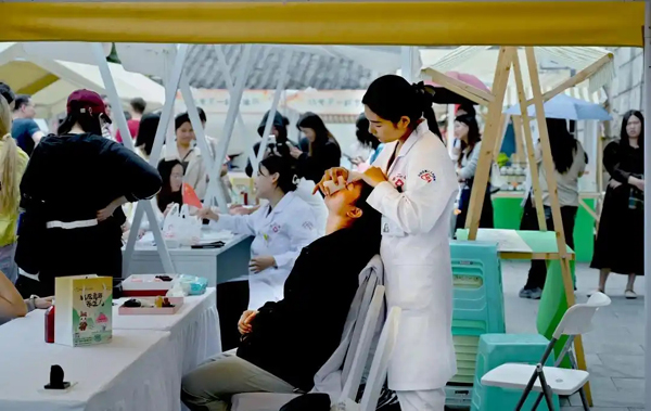 国庆首日的贵阳文昌阁,飞檐斗拱间沉淀着老城韵味,文昌阁外的广场上,一场热闹的中医市集正让传统养生以鲜活姿态走进年轻人的假日生活。市集刚一开市便被游客围得满满当当,不同于以往中医场景里常见的中老年身影,现场大半参与者是20岁左右的年轻人,青春面庞与草药香相映成趣。 “听说能免费号脉,还能学简单的养生小技巧,就拉着同学过来了。”来自贵州大学大四的同学告诉记者,手里打着遮阳伞,正排在脉诊摊位后耐心等候。 市集现场,针灸体验、面部刮痧、中药辨识等摊位前均排着长队。在中药展示区,几位大学生围着装中成药玻璃罐好奇提问,医护人员一边讲解功效,一边教大家搭配适合日常饮用的养生茶;按摩推拿摊位上,有人尝试通过按摩缓解颈椎不适,有人则请医生帮忙缓解旅游带来的水土不服。 据了解,此次中医市集从10月1日持续至4日,旨在通过“接地气”的方式让中医文化走进大众生活。 文昌阁的飞檐下,古老建筑与年轻身影、传统中医与现代生活在此交融。这场国庆假期里的中医市集,不仅成了游客体验传统文化的新打卡点,更让“看中医、学养生”成为年轻人假日里的新风尚。 贵州日报天眼新闻记者 程洁 编辑 杨涛 二审 王纯亮 三审 成嘉廷 |