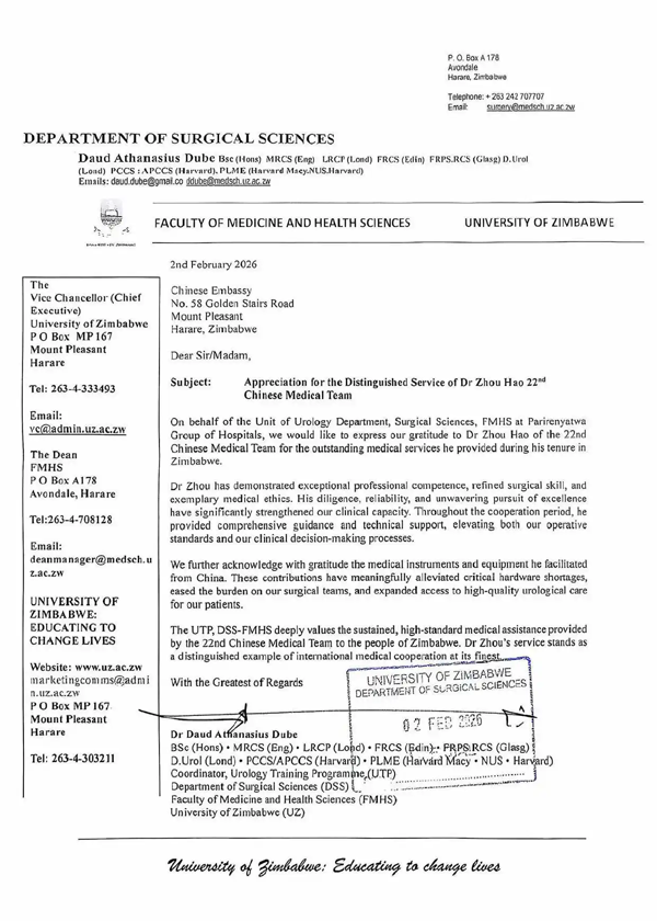 红网时刻新闻2月7日讯(通讯员 刘丹)“谨向第22批中国医疗队的周浩医生致以诚挚谢意,感谢他在津巴布韦任职期间提供的卓越医疗服务。”2月2日,中国驻津巴布韦大使馆收到一封感谢信,信中对中国(湖南)第22批援津巴布韦医疗队队员、湖南中医药大学第二附属医院(湖南省中医院)泌尿外科副主任医师周浩予以感谢。据了解,自2025年3月至2026年2月4日,他带领团队开展隐睾、鞘膜积液、前列腺增生、膀胱肿瘤等各类手术共170余人次,门诊接诊患者500余人次,为当地群众提供医疗服务610余次。