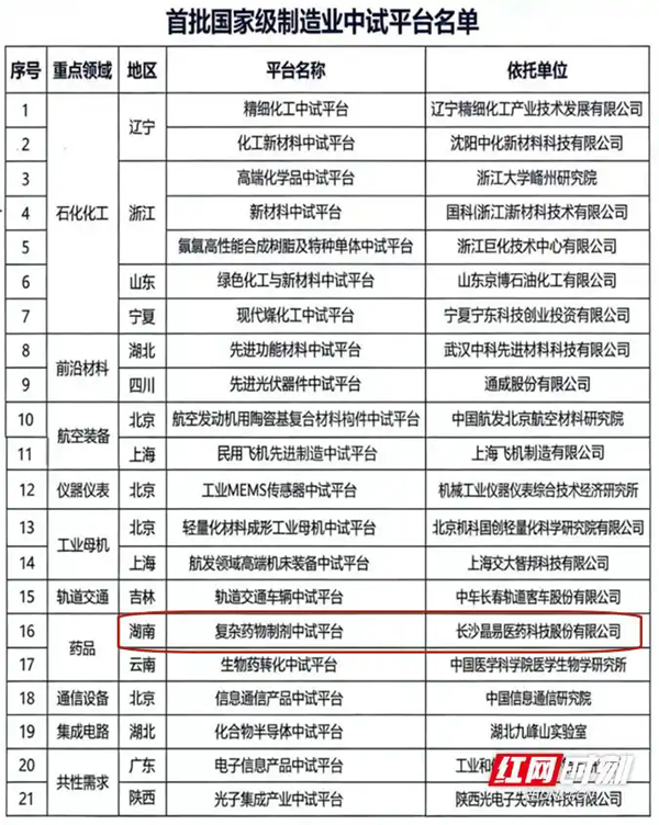 | 红网时刻新闻记者 胡冲 通讯员 刘理可 长沙报道 近日,工业和信息化部正式公布首批国家级制造业中试平台名单,全国仅21家平台通过遴选脱颖而出。其中,由长沙晶易医药科技股份公司建设运营的“复杂药物制剂中试平台”成功入选,成为此次名单中化学药领域唯一的国家级中试平台。这一突破不仅标志着湖南在国家生物医药创新体系布局中抢占关键节点,更为破解科技成果转化“中梗阻”、培育医药产业新质生产力提供了可复制推广的“湖南方案”。 首批国家级制造业中试平台名单。 在湖南湘江新区晶易医药园区内,记者看到,国内首个申报美国FDA、可实现持续释药5天的儿童多动症透皮贴剂,正从“复杂药物制剂中试平台”的精密生产线有序产出。“该产品的中试量产,填补了国内高端儿童透皮制剂领域的技术空白,也实现了我国复杂药物制剂从实验室研发向产业化应用的关键跨越。”平台相关负责人介绍。 严苛遴选跻身“国家队” 实现从省级基地到国家支点跨越 中试,是科技成果从实验室走向产业化的必经环节,更是跨越创新“死亡之谷”的核心桥梁。此次国家级制造业中试平台遴选标准严苛,历经多环节层层筛选,从全国2400余家中试平台中初步确定242家重点培育对象,最终仅21家被认定为首批国家级平台。 晶易医药此次入选并非偶然。作为湖南省工信厅长期重点培育的产业创新载体,该平台已构建起完善的研发转化体系和成熟的服务能力。近年来,省工业和信息化厅认真落实“做强一批、激活一批、补齐一批”产业创新载体培育部署,通过政策扶持、资金引导、资源整合等举措,持续推动平台迭代升级。此次成功晋级国家级,标志着该平台正式实现从省级创新节点向国家级战略支点的跨越式跃升。 晶易医药建设运营的“复杂药物制剂中试平台”。 这一跃迁背后,承载着国家对关键产业自主可控的深远考量。当前,我国虽是制药大国,但在技术壁垒较高的复杂药物制剂领域仍处于追赶阶段。数据显示,全球复杂药物制剂市场长期由欧美企业主导。而长效缓控释制剂、靶向给药系统、透皮贴剂、儿童友好剂型等复杂制剂,直接关系临床用药有效性、安全性及患者生活质量,是应对人口老龄化需求、提升全民健康水平的重要支撑。 “我们的目标是,用30年时间让中国人民在复杂药物制剂领域的用药水平,达到与发达国家相近的标准。”平台负责人、中南大学湘雅药学院丁劲松教授表示,这一目标与国家医药产业升级战略高度契合。晶易医药总裁张海龙补充道:“平台聚焦的经皮及黏膜递药、药物掩味与矫味、药物控释与调释三大方向,均为《‘十四五’医药工业发展规划》明确的关键攻坚领域。”入选国家级平台后,该平台将正式肩负起突破关键核心技术、保障医药产业链供应链安全稳定的国家使命。 锻造全链条“硬实力” 系统性破解产业化难题 将实验室毫克级样品转化为工厂规模化、稳定可控、成本合理的产品,是医药成果转化的核心痛点。晶易医药国家级中试平台的核心竞争力,在于构建了一套覆盖全流程的系统化工程解决方案。 公开资料显示,晶易医药成立于2010年8月,是一家专注于创新药与复杂制剂研发全链条服务的CRO企业,业务覆盖药物发现与筛选、实验室服务、测试服务、临床服务、CMO(原料/制剂)、国内外申报注册等全流程,已形成“研发-中试-产业化”的闭环服务能力。 硬件支撑方面,平台累计投入超7300万元,布局凝胶贴膏、热熔贴片、透皮贴剂、直服颗粒等13条专业化中试线。其中,多台核心装备为平台与国内领军企业联合攻关成果:联合研发的国产首台多层兼容中试涂布机,涂布精度达到国际先进水平;自主定制开发的微粉包衣设备,可生产全球最小粒径的直服颗粒丸芯,成功攻克儿童药“无沙砾感”的世界性难题,为高端儿科制剂研发奠定基础。 “平台已累计服务国内外制药企业超200家,推动30余个复杂制剂项目进入中试及产业化阶段,其中12个项目实现上市转化。”张海龙介绍,通过中试平台的技术支撑,企业新药研发周期平均缩短1-2年,产业化成功率提升30%以上。 省工业和信息化厅相关负责人表示,晶易医药“复杂药物制剂中试平台”入选国家级,将进一步带动湖南生物医药产业创新资源集聚,加速破解“实验室成果多、产业化成果少”的转化困境。下一步,湖南将以该平台为依托,持续完善生物医药产业创新体系,推动更多高端医药成果在湘转化落地,助力生物医药产业成为全省战略性新兴产业的重要增长极。 |