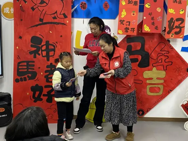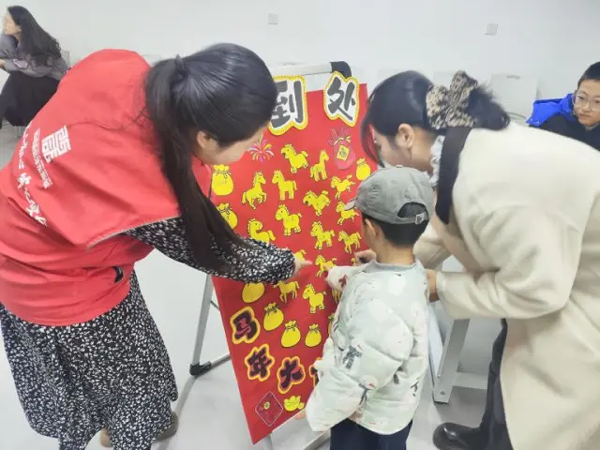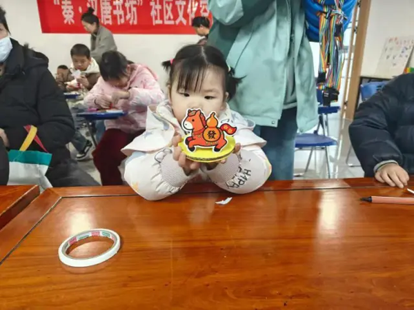 上林街道金湾社区实践站的萌娃迎春活动同样充满书香与年味。孩子们在新年律动中舒展身姿,在志愿者带领下共读绘本《过年啦》,从贴春联到守岁拜年,听得入神。随后的手工环节,大家剪贴涂画,制作出一个个色彩鲜艳的“新年摇摇马”,并在马身背面写下祝福。孩子们勇敢上台送出“马到成功”等吉祥话,稚嫩的声音传递着最纯粹的美好,也为寒假生活添上一抹亮色。