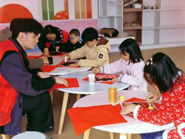 上林街道三里桥社区实践站则带领青少年们走进实践。在乐高创意拼搭环节,孩子们将脑海中的新春景象化作积木作品,有的拼出“春回大地”,有的搭建“航天飞机”。志愿者围绕二十四节气与春节来历展开生动讲解,随后的非遗拓印环节,孩子们亲手制作“福”字、节气图案,让传统文化从纸上“活”在指尖。作为志愿者参加活动的王女士欣慰地说:“能把老传统传给孩子们,我心里特别高兴。”