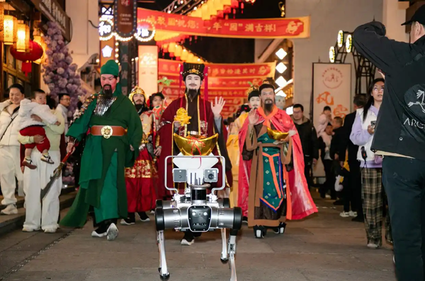龙游传媒供图 提前布局新赛道,释放本地制造优势 对于人形机器人,人们不再陌生。这个春节,宇树科技再次惊艳世界,不仅完成了全球首次人形机器人集群武术表演,更在跑酷翻桌、蹬墙借力、空中转体等动作中,展现了毫米级定位精度与厘米级落点控制能力,用一场“赛博真功夫”刷新了全球对中国智造的认知。 而在位于浙西的龙游大南门历史文化街区,在春节期间也迎来了一群特殊的“科技明星”——轮式机器人、仿生机器狗提前亮相,以灵动之姿穿梭于古色古香的街巷间。它们不仅能主动挥手致意,还能与游客展开“石头剪刀布”的趣味互动,引得众人纷纷驻足拍照,成为春节期间最吸睛的“科技风景线”。