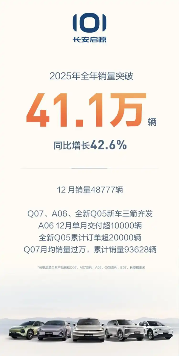 长安启源作为“智能移动生活家”,去年推出了长安启源Q07、A06、全新Q05等多款深受家庭用户欢迎的新车型,其中,A06 12月单月交付超1万辆,全新Q05累计订单超2万辆,Q07月均销量过万,累计销量93628辆,成功推动领先新能源技术普惠化。2025年全年销量突破41.1万辆,同比增长42.6%,强势崛起。