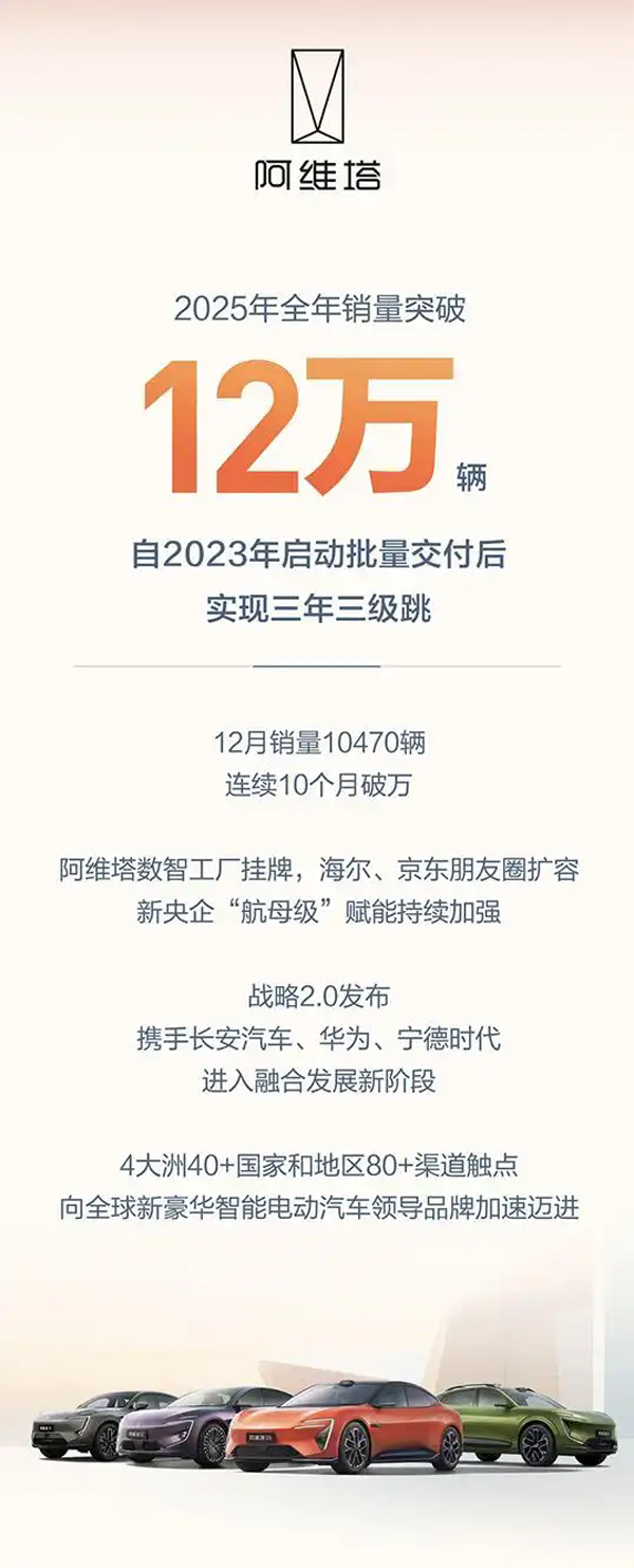 在整体销量创新高的同时,长安汽车2025新能源板块更实现了里程碑式跨越。全年新能源销量达110.9万辆,同比增长51%,跻身行业顶尖的“新能源百万销量俱乐部”。这一里程碑式突破,不仅源于技术优势向市场竞争力的持续转化,更源于阿维塔、深蓝汽车、长安启源三大全球数智新能源品牌矩阵的协同构建、以及产品势能的集中释放。 其中,定位“原创、智能新豪华汽车品牌”的阿维塔,2025年全年销量突破12万辆,自2023年启动批量交付后实现三年三级跳。其中,12月销量10470辆,已连续10个月破万。面向2026年及未来,阿维塔将向全球新豪华智能电动汽车领导品牌加速迈进。