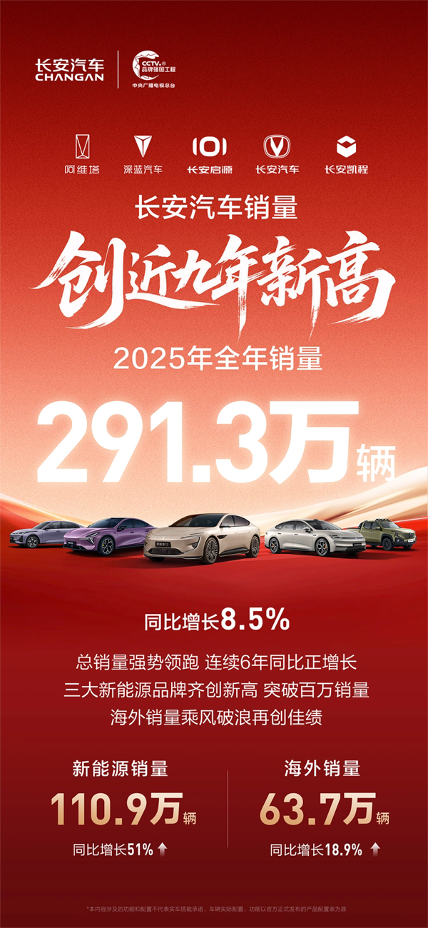 1月2日长安汽车发布销量快报:2025年全年总销量291.3万辆,同比增长8.5%,创近9年新高。与此同时,新能源板块首破百万大关,三大新能源品牌齐创新高;海外市场再创佳绩。“四大维度齐创新高”的表现,系统展现了企业高质量发展的强劲势头和可持续发展的战略韧性。