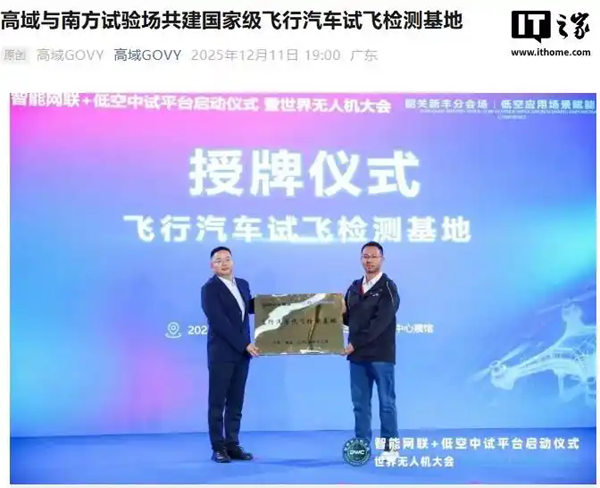 IT之家消息,据广汽高域官方公众号,在 12 月 11 日举行的 2025 世界无人机大会上,中国低空经济领域迎来里程碑式突破 —— 高域与南方试验场在韶关市新丰县合作建设的“飞行汽车试飞检测基地”(以下简称“基地”)正式授牌。