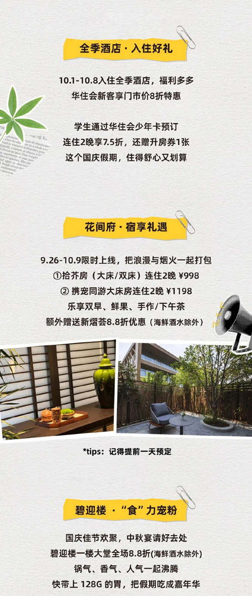 在森兰湾,即日起至10月8日入住全季酒店,华住会新客享门市价8折特惠,学生通过华住会少年卡预订连住2晚享7.5折,还赠升房券1张。即日起至10月9日入住花间府拾芥房(大床/双床)连住2晚¥998;携宠同游大床房连住2晚¥1198,乐享双早、鲜果、手作/下午茶,额外赠送新熠荟8.8折优惠(海鲜酒水除外)。碧迎楼一楼大堂全场8.8折(海鲜酒水除外)。
