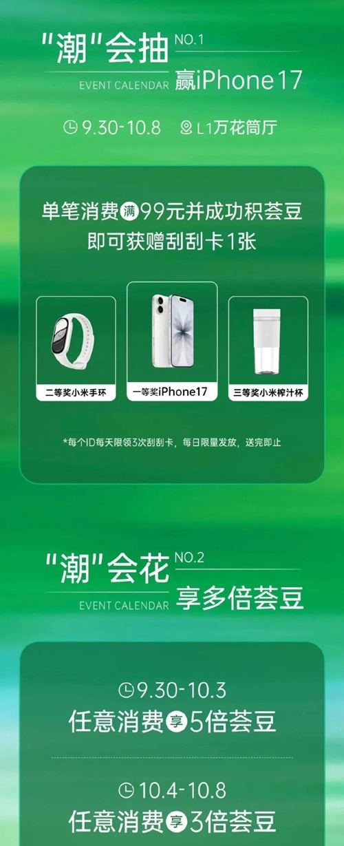 PART.01 森兰花园城 森兰花园城五周年庆全攻略上线!9月30至10月8日,逛吃嗨购,福利再加码,单笔消费满99元并成功积荟豆,即可获赠刮刮卡1张,任意消费享多倍荟豆。