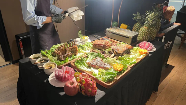 1月初新开业的“拉蒂娜·巴西牛排馆”,从门头设计到锅具全是红红火火,桌花也特意选了红金配色。店长徐少华告诉记者,环球美食成了不少消费者的年夜饭新选择,“平时多是两三人用餐,年夜饭一桌6人左右。”除夕当晚,餐厅特意营造了更热闹的节日氛围的展台,分享整扇的羊排、T骨牛排、慢烤牛胸肉和牛腹肉,很有仪式感。