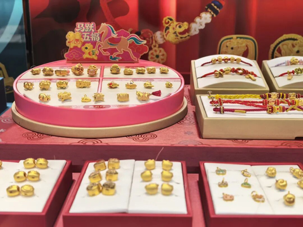 珠宝品牌“潮宏基”柜台前,店员们正忙着编绳——各种喜庆颜色的绳子,配上发财结、如意结,一件件饰品在指尖成型。店长田慧茹介绍,假期里品牌克减100元,马年生肖款特别受欢迎:可以转动的马卡龙色系“旋转木马”、打开藏着一匹小马的“福袋”,身上有不同字体“福”字的“五福马”,都是热销款。