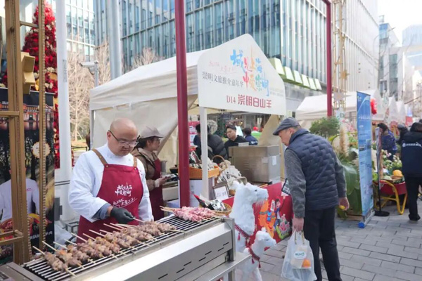 现场,市民游客能以优惠价选购特色年夜饭、预定民宿、订购特色农产品、品尝特色美食。用非遗美食崇明白山羊制作的羊肉串,销售格外火爆。“我们带来了大约200串羊肉串,供不应求。”瀛洲宴展位负责人王先生说:“带少了,还要补货。”