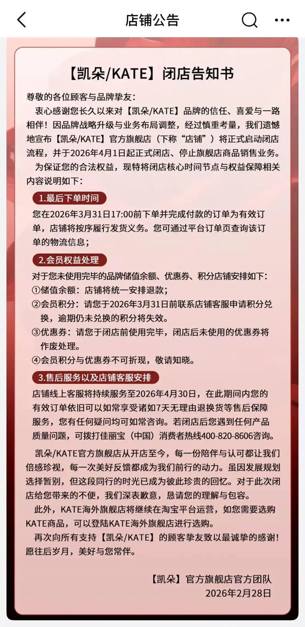 潮新闻客户端 记者 王景平 “KATE的眉粉这么好用,为什么要关啊?”“开架彩妆的鼻祖,用他们家眼影和眉粉用了十几年了!”“一口气怒买了3盒,这下真要变成时代的眼泪了。” 近日,花王集团旗下经典彩妆品牌KATE凯朵,接连在抖音官方旗舰店、天猫官方旗舰店发布闭店告知书,宣布店铺将于2026年4月1日起正式闭店。消息一出,瞬间在社交平台掀起了一场集体怀旧热潮,无数网友直呼“我的青春结束了”。 KATE凯朵抖音官旗公告 知名彩妆品牌宣布闭店引粉丝热议 作为无数人化妆路上的启蒙品牌,KATE的闭店消息让大批消费者猝不及防。截至闭店公告发布时,KATE一电商平台官方旗舰店的粉丝量仍高达230万,招牌产品三色眉粉的月销量更是高达10万+,居平台眉粉热卖榜TOP1。 根据店铺发布的公告,品牌已针对消费者权益做出明确安排:持有品牌积分、储值余额尚未使用的用户,需在2026年3月31日前联系客服办理积分兑换、余额原路退回;店铺线上客服将持续服务至2026年4月30日,在此期间的有效订单仍可享受7天无理由退换货等售后保障。 面对“是否退出中国市场”的猜测,花王集团相关负责人回应媒体称:“本次闭店仅涉及KATE品牌在中国线上渠道的优化调整。未来,KATE品牌的海外旗舰店将继续在天猫平台运营,消费者仍可通过该渠道购买产品。”同时,KATE的京东自营旗舰店、京东旗舰店目前均在正常运营中。 入华17年,怎么就运营不下去了? 这场突如其来的闭店,让很多人想起了KATE曾经的高光时刻。1997年诞生于日本的KATE,凭借高性价比的产品定位和“No More Rules”的先锋品牌理念,被誉为“平价日妆鼻祖”,在日本本土市场连续多年位居彩妆销量冠军。 2010年,KATE以屈臣氏为落点正式进入中国市场。彼时,国货彩妆尚未崛起,欧美大牌价格偏高,KATE凭借骨干眼影、三色眉粉等王牌产品,迅速席卷平价彩妆圈,成为一代女生化妆包里的标配。 “我的第一盘眼影就是KATE的骨干眼影,当年学生党没什么钱,几十块就能买到粉质、配色都在线的大牌平替,身边同学几乎人手一盘。”一位网友在社交平台分享道。“用空了3盘它家眉粉,防水防汗不结块,这么多年换了无数网红眉笔,最后还是会换回它。”“从高中用到职场,它见证了我从化妆新手到熟练化妆的全过程,说关就关真的太舍不得了。” 还有网友调侃:“是不是因为太耐用了,复购率低才运营不下去的?” 国货彩妆崛起,改写市场格局 KATE的退场,并非孤例。2026年开年至今,已有hince、菲洛嘉、伊蒂之屋、Grow Gorgeous等外资品牌陆续关闭中国线上旗舰店。而与此同时,国货美妆正以前所未有的速度抢占市场份额。 中国香料香精化妆品工业协会有数据显示,2025年国货品牌市场份额已连续五年增长,首次突破57%,扎扎实实坐稳了“半壁江山”。曾经“大牌平替”的标签正在被撕下,国货美妆已从“流量驱动”转向“价值驱动”。 与此同时,完美日记、橘朵、花西子等国货彩妆品牌,不仅在价格上更具优势,产品迭代速度更快,还能通过联名、场景化营销精准捕捉年轻消费者的心智。曾经的“大牌品质+平价价格”护城河,已被国潮美妆颠覆。 开架彩妆鼻祖为何走到这一步? 从外部环境看,国货彩妆的强势崛起直接挤压了KATE的生存空间。当年KATE的核心优势,如今被国货品牌以更低的价格、更快的迭代、更懂本土消费者的营销全面超越。 从集团战略看,闭店背后是母公司的取舍。在花王集团2025年发布的K27中期经营计划中,集团明确提出向高端化倾斜,并将芙丽芳丝和珂润作为在中国市场推动本土化开发的重点品牌。KATE作为大众价位彩妆,在中国市场的资源投入相应缩减,最终走向核心旗舰店关停。 值得注意的是,国际巨头的潮水方向正在发生深刻变化。LVMH被传计划剥离包括馥蕾诗、玫珂菲在内的多个大众向品牌,试图轻装上阵守住奢侈品腹地。而作为高端美妆“守门人”的丝芙兰,也开始把抖音上跑出来的国货彩妆——三资堂、BABI、酵色等品牌摆上C位货架。曾经非大牌不卖的丝芙兰,如今用脚投票,拥抱国潮。 对于无数消费者而言,KATE的双平台闭店,或许已成为“时代的眼泪”。当国货彩妆以57%的市场份额重新定义行业格局,当“成分党”和“功效党”成为消费主流,那个属于日系开架彩妆的黄金时代,正悄然落幕。 |