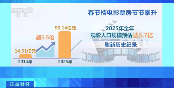 (央视财经《正点财经》)春节临近,备受期待的2026年春节档电影正式拉开帷幕。预售渠道今天(2月9日)正式开启,截至16时,档期预售总票房突破5千万元。 据了解,今年春节档影片各具特色,竞争亮点十足。《惊蛰无声》作为国内首部国家安全题材电影,获国家安全部直接指导;《镖人:风起大漠》改编自热门国漫,以实景拍摄和真实打斗重现硬核武侠精神;《飞驰人生3》引入AI赛车元素,延续前作的笑点与情怀;动画电影《熊出没·年年有熊》;科幻冒险电影《星河入梦》;功夫喜剧《熊猫计划之部落奇遇记》等为观众带来不同的观影选择。 数据显示,十多年来,春节档票房节节攀升,从2014年的14.51亿元到2025年的95.14亿元,增长超5.5倍;2025年全年观影人口规模预估达5.7亿,刷新历史纪录。业内人士认为,庞大的观影基数为2026年春节档奠定了坚实基础。 灯塔专业版数据分析师 陈晋:我们可以看到,春节档预售通道开启后,市场热情迅速释放。一直以来,春节档是市场瞬时爆发力与观众消费热情最极致的体现,中国影史单日票房TOP5中,有4次出现在大年初一。2026年,春节假期长达9天,这个“史上最长春节档”为电影票房冲高提供了更充裕的时间窗口。 来源:央视财经 编辑:令文芳 |