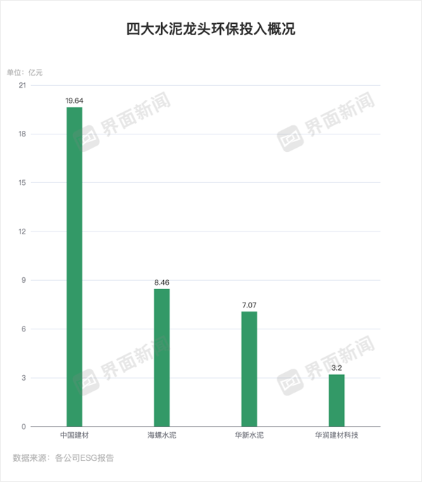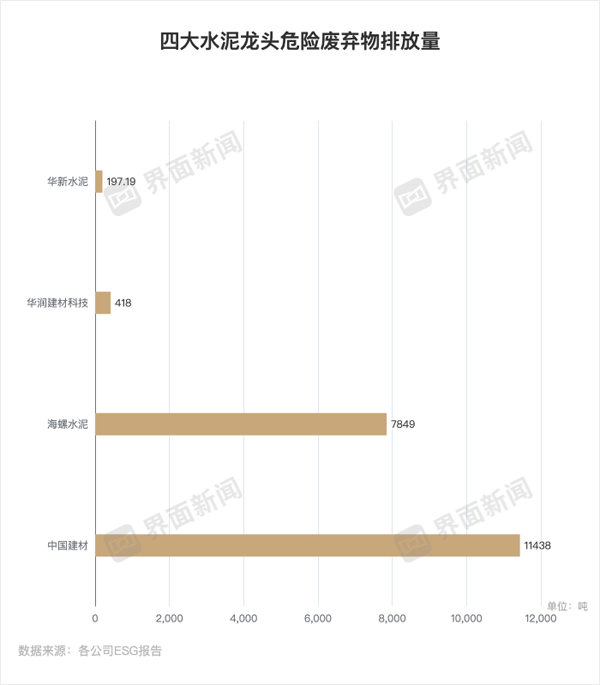 界面新闻记者 | 田鹤琪 中国是全球最大的建材生产国和消费国。由于产业规模大、窑炉工艺特点等原因,建材行业也是工业能源消耗和碳排放的重点领域,是中国碳减排任务最重的行业之一。 今年3月,水泥行业正式纳入全国碳市场。 从碳排放现状看,目前水泥行业碳排放量约占全国碳排放总量的9%。中国是全球水泥制造第一大国,2019年全球水泥产能为37亿吨,中国约占其中60%。 今年5月,中国水泥协会发布了《2025年中国水泥上市公司综合实力排名的公告》称,从2025年中国水泥上市公司综合实力排名结果来看,排名前5位的公司分别是海螺水泥(600585.SH),中国建材集团有限公司(03323.HK,下称中国建材)、华新水泥(600801.SH)、天山股份(000877.SZ)和华润建材科技(01313.HK)。 天山股份是中国建材旗下的核心子公司,主营水泥、熟料、商品混凝土和骨料的生产及销售。因此天山股份不再单独比较。 温室气体排放总量是衡量企业碳足迹的核心指标。此次四家企业均披露该数据,且均包含范围一和范围二。 根据国际排放核算工具温室气体(GHG)核算体系,范围一温室气体排放量是指企业拥有或控制的排放源所产生的直接排放量;范围二是指公司消耗的外购电力、热力或冷源产生的间接排放。 制图:田鹤琪 四家企业去年温室气体排放总量均有所下滑。 其中,海螺水泥温室气体排放量总量为1.82亿吨二氧化碳,排放量居四家之首,同比下降0.88%。 中国建材去年温室气体排放量总量为1.67亿吨二氧化碳当量,同比下降15.3%。 华新水泥同期温室气体排放量总量为3062.15万吨二氧化碳当量,同比下降约12%。 华润建材科技去年温室气体排放量总量为4034.7万吨二氧化碳当量,同比下降3.4%。 中国建材同时披露了范围三的数据,为5326.15万吨二氧化碳当量,这也是该公司首次开展范围三盘查。 根据温室气体核算体系界定,温室气体范围三排放量包括公司价值链公司价值链中发生的所有其他间接排放,包含购买的商品和服务、与燃料和能源相关的活动、上游运输和配送以及员工通勤和商旅出差等环节。 四家企业均披露了危险废弃物总量这一关键环境绩效指标。 制图:田鹤琪 2024年,中国建材自产有害固体废弃物产生量1.14万吨,居四家之首,同比上涨38.6%,针对上涨原因,其表示本年度公司完成对北新嘉宝莉的收购工作,并将其纳入数据统计范围,造成涂料业务危险废弃物产生量上升。 其次是海螺水泥危险废弃物排放量为7849吨,同比上涨48.6%。 华润建材科技和华新水泥的危险废弃物排放量分别是418吨、197.19吨,同比下降5%、9.7%。 能源消耗总量方面,四家公司该数据均有所下跌。 “能源消耗总量”通常指企业在一定时期内所消耗的所有能源的总和。其不仅涵盖直接能源消耗,即企业直接使用的能源,如电力、天然气、煤炭、石油等;也包括间接能源消耗,指的是企业在生产和运营过程中间接消耗的能源,例如外购的热力和电力等。 海螺水泥去年该指标数据为2亿兆瓦时,同比下降2%;中国建材1.82亿兆瓦时,同比下降20.4%。 华新水泥519.51万吨标煤,同比下降3.4%;华润建材科技522.2万吨标煤,同比下降2.8%。 环保投入方面,2024年,中国建材总环保投入金额为19.64亿元,海螺水泥开展了307个环保技改项目,全年环保技改投入约8.46亿元。 制图:田鹤琪 其次分别是华新水泥,环保技改投入总额为7.07亿元,华润建材科技环保总投入为3.2亿元。 中国建材的环保投入总额大于另外三家环保投入总和。 2022年11月,工业和信息化部、国家发展和改革委员会、生态环境部、住房和城乡建设部等四部门联合发布《建材行业碳达峰实施方案》,其中明确了“强化总量控制、推动原料替代、转换用能结构、加快技术创新、推进绿色制造”五方面重点任务。 推动原料替代方面,例如,中国建材推出绿色低碳属性的基础建材产品,包含回收材料、 使用替代原/燃料、具有较低碳足迹或具有更低污染特性的绿色产品。去年天山股份建成89条替代燃料生产线,替代标煤量76.7万吨,热替代率4.19%,较2023年上升2.60个百分点。 华新水泥自主研发多组分燃料混烧型燃烧器,用于窑头替代燃料的使用。窑头替代燃料热替代率可提高20%,吨熟料标煤减少约10千克。 其子公司华新地维公司以固体废弃物替代燃料推动水泥行业可再生能源应用,替代燃料热量替代率提高3.5倍以上。 海螺水泥提出到2030年,替代燃料使用占比达到15%,去年目标进度达到了13%。 同时,多家公司也在推行节能降碳技术改造。 去年中国建材子公司天山股份实施预热器优化、篦冷机改造等节能技改156个,全年节电2.04亿千瓦时、标煤12.2万吨,减排二氧化碳79.72万吨。 华润建材科技去年投入471万元开展设备更新和节能改造工作,成功推广应用1台大型高效节能离心风机、7台高效节能空压机、5台节能鼓风机、88台节能电机,进一步淘汰高能耗落后机电设备,提升用能设备节能水平,每年可节约电量约349.62万千瓦时,节约电费约174.81万元。 海螺水泥改进二氧化碳捕集与利用项目,如公司旗下白马山水泥厂二氧化碳捕集纯化示范项目采用化学吸收法,产出高纯度工业级和食品级液态二氧化碳,并将其作为植物气肥应用于厂内的智慧农业项目,降低化肥依赖。 华新水泥实施二/三次风技改优化,3条线改造后二次风温升高40-70℃,吨熟料标煤下降约1kg。同时,提升预热器C1分离效率,7条线改造后分离效率提升2%以上,